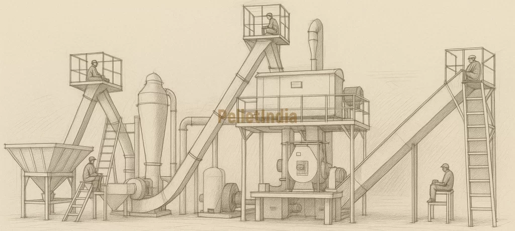 🌱 Inside a PelletIndia Fully Automated Biomass Pellet Plant: Key Machinery & Layout PelletIndia’s 5 TPH Fully Automated Biomass Pellet Plant is a cutting-edge facility designed for high efficiency, minimal human intervention, and consistent pellet quality. This real-world setup integrates smart automation, heavy-duty equipment, and an energy-efficient layout to ensure 24/7 operation with only 2 operators per shift .